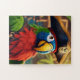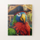 Un puzzle animé de perroquets présentant un perroquet coloré perché dans un cadre luxuriant de jungle, entouré de fleurs exotiques et de verdure