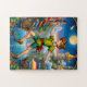 Peter Pan, debout avec les bras tendus. Derrière lui se trouve une scène fantastique : un ciel illuminé de lune, orné d'étoiles et de nuages, flanqué de deux châteaux élaborés reliés par un pont arc-en-ciel. En contrebas, des voiliers flottent sur l'eau au milieu d'une végétation luxuriante et de fleurs, encadrées de vignes d'escalades ou de haricots.