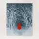 Petit chaperon rouge sur une promenade hivernale enneigée à travers les bois. Pouvez-vous voir le Big Bad Wolf hurler au loin ? Version grungy d'un tableau d'aquarelle négatif.