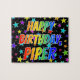 Ce design de puzzle passionnant et animé sur le thème de l'anniversaire a le message "HAPPY BANTHDAY, PIPER" avec les personnages ayant un spectre arc-en-ciel coloré inspiré motif dégradé, ainsi qu'un champ vibrant d'étoiles arrière - plan motif. Un puzzle vibrant comme celui-ci pourrait être une façon amusante d'envoyer des salutations d'anniversaire à quelqu'un nommé Piper. [~Z0000468]