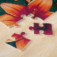 Un joli puzzle tropical avec une belle scène de plage avec palmiers, fleurs tropicales, eau bleue et poteries se lavant jusqu'au rivage.