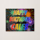 Cette conception amusante, vibrante, sur le thème de l'anniversaire, de puzzle a le message "HAPPY BANTHDAY, CALEB" avec un motif coloré du spectre arc-en-ciel inspiré de gradient, et un feu d'artifice festif animé inspiré des motifs arrière - plans. Un puzzle coloré comme celui-ci pourrait être une façon amusante d'envoyer un message de voeux d'anniversaire à quelqu'un nommé Caleb. [~Z0000465]