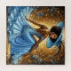 A captivating woman exudes regal elegance, adorned in a dazzling azure blue gown with intricate silver embellishments and a matching wide-brimmed hat. She poses gracefully against an opulent golden background, shimmering with celestial light and intricate floral motifs, creating a scene of luxurious fantasy.