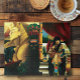 Reine égyptienne avec un dragon rouge sur son épaule. La Reine tient une orbe d'univers. Un lion noir avec des ailes est sur une montagne avec un sphinx derrière.
