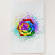 Grand rose fleuri avec pétales arc-en-ciel sur arrière - plan blanc, peint sur des éclaboussures de peinture colorée et lumineuse. 3d