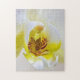 Orchidée blanche et jaune couverte de rosée, rappelant une journée d'été fraîche et humide.