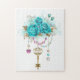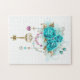 Clé d'or antique aux roses turquoise tendance décorée de feuilles d'or blanc et de perles rose et bleu. Couleur tendance. Rose turquoise. Blanc doré. Tiffany bleu.