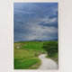 Casse-tête d'une photographie d'un chemin de terre blanc d'enroulement (bianca de strada) par les collines vertes de roulement du paysage de vallée de d'Orcia de Val en Toscane, Italie sous les nuages foncés dans le ciel.