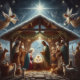 Cette belle et festive crèche s'ajoute parfaitement à votre décor de Noël. L'oeuvre présente la Sainte Famille, Marie, Joseph et le bébé Jésus, entourés d'anges et de bergers en adoration. La scène est placée sur un fond d'étoiles scintillantes et d'une étoile brillante, symbolisant la naissance du Christ. Cette image intemporelle est un rappel du vrai sens de Noël. Image créée avec AI