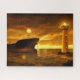 Scène nautique avec phare au coucher du soleil orangé. frontiernow.com