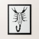 Ce puzzle impressionnant présente une image art numérique d'un scorpion noir avec de grandes griffes et une grande piqûre sur la queue courbée au-dessus du haut de son corps, avec le mot Scorpio en texte noir gras dans le corps de l'arachnid. Un design amusant pour les gens célébrant un anniversaire né entre le 24 octobre et le 21 novembre sous le signe étoilé de Scorpio.