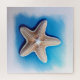 An illustration of an orange starfish with a bluish background. Crayon drawing.