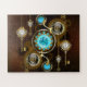 Turquoise lenses with antique watch with brass gears and golden keys on rusty, brown background. Steampunk style.