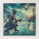 This elegant winter messenger travels along the ice on ice skates in this steampunk Victorian fantasy world towers a tower in this detailed fantasy artwork puzzle.