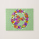 Un signe de paix fleuri dans les tons rose, jaune, orange, violet, vert, blanc et noir.