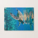 Photo sous-marine d'une tortue de mer nageant dans une eau cristalline juste en dessous de la surface.