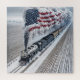 Une vieille locomotive à vapeur traverse une ferme humide enneigée du Midwest, où la vapeur forme la conception du drapeau américain au-dessus.