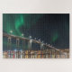 Photo de voyage de Northern Lights (Aurora borealis) au-dessus de la ville de Tromsø en Norvège du Nord, Scandinavie. Le célèbre pont Tromso au premier plan. Photo : Tromsdalen.