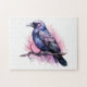 Un puzzle à l'image d'un corbeau noir aux ailes violettes roses. Une aquarelle rose derrière cet oiseau mystique.