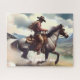 Cette conception abstraite moderne a un cowboy à cheval gris avec des montagnes au loin.