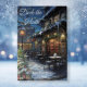 Nostalgic vintage look Noël "Deck the Halls" scène de restaurant village de vacances avec une fenêtre de restaurant ornée de drapeaux de pin, montrant les lumières dans la fenêtre. Quelques tables sont installées à l'extérieur, une d'entre elles étant surmontée d'un joli boule de neige. Les lumières des rues sont allumées et les lumières des magasins sont allumées en prévision de la tombée de la nuit. Un sapin de Noël est enneigé avec des boules et des cadeaux en dessous. Ajoutez votre salutation de vacances unique, l'année et le nom de famille ou les noms de votre choix pour un souvenir unique qui peut être amusant pour toute la famille.