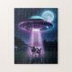 Scène mystérieuse d'un OVNI soulevant une vache dans un rayon de lumière sur fond de ciel nocturne avec une pleine lune. Illustration parfaite pour les fans de science-fiction, et histoires fantastiques sur le contact avec des civilisations extraterrestres.