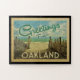 Ce design de carte postale vintage Greutings From Oakland dispose d'une plage de sable avec une belle eau turquoise de l'océan et au-dessus de la mer, un ciel bleu avec des nuages blancs lustrés. Dans un style de voyage vintage.