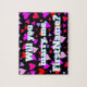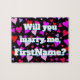 Ce puzzle de proposition de mariage d'amusement comporte une question comme, "vous m'épousera, FirstName ? ", où le nom peut être personnalisé. Il comporte également un motif des formes de coeur rouge, rose et pourpre de diverses tailles sur un arrière - plan noir.