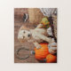 Un chiot de récupération du Labrador jaune se trouve au milieu d'une récolte d'automne de citrouilles, de gourdes, de maïs indien et d'une balle de foin. Et le mur de la grange en bois de l'arrière - plan est décoré d'un vieux fer à cheval rouillé et de plumes de dinde. OEuvre réaliste créée à partir d'une peinture à l'huile originale de l'artiste animalière Crista S. Forêt.