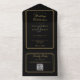 Einladende Einladung zur Hochzeit in Schwarz und Gold mit eleganter Typografie und Monogramm-Initialen. Die Einladung beinhaltet ein perforiertes UAWG mit Ihrem Hochzeitswebsite QR Code und Details. Entwickelt von Thisisnotme©