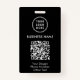 Modernes und berufliches Black-ID-Abzeichen für Ihr Business oder Ihre Veranstaltung mit Logo und QR-Code. Fügen Sie Ihren Geschäfts- oder Veranstaltungsnamen und andere Informationen in einfacher weißer Typografie hinzu.