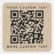 Quadratische Aufkleber mit QR-Code und benutzerdefiniertem Text, eine Zeile oben und eine unten auf einem gedruckten Papier aus Kraft-Papier im Hintergrund. Ändern Sie die Schriftart- und Schriftart-Farben, verschieben und verändern Sie Elemente mit dem Entwurfstool. Folgen Sie uns auf Facebook: @business stationery oder Instagram: @business.perfect custom for more products, news, sales and more.