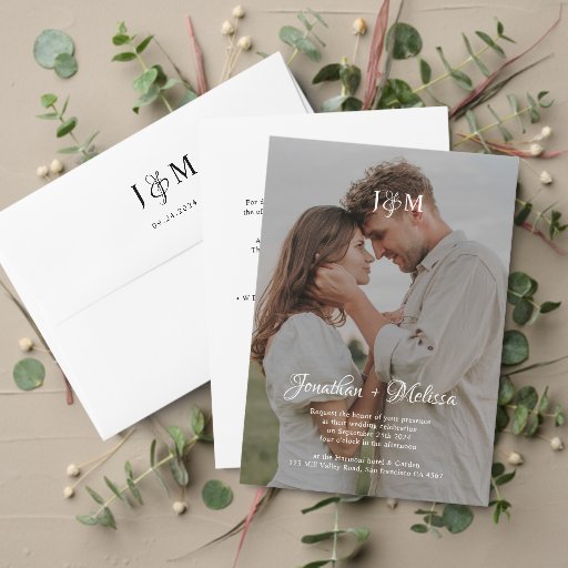 Ein moderner Haushalt All in One Wedding Einladung beinhaltet zwei Fotos vorne und hinten mit QR-Code für Online-uAwg und andere Hochzeitsdetails auf der Hochzeitswebsite. Elegant und einfach zu personalisieren!