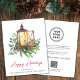 Firmenfeiertagskarte mit einer Aquarellbild-Abbildung einer Weihnachtskerzenleuchte in einer Anordnung von saisonalen Kiefern, Eukalyptusbeeren und Grünpflanzen. "Happy Holidays" ist in einem zeitgenössischen roten Drehbuch geschrieben und Sie können Ihren Gruß und den Namen Ihres Unternehmens in einfacher moderner Typografie personalisieren. Fügen Sie auf der Rückseite eine zusätzliche Nachricht zur Kundenzufriedenheit hinzu, laden Sie Ihr Firmenlogo hoch und geben Sie Ihre Website-Adresse ein, um einen QR-Code zu erstellen, den Kunden scannen können, um eine Verbindung zu Ihren Online-Plattformen herzustellen.