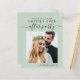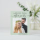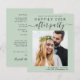 Stilvolles, preisbewusstes und schlaues Grün/private Hochzeitsankündigung und Empfang Save the Date, das Ihr Hochzeitstag-Foto und "Save the Date für unser glückliches Jubiläum nach dem Party" in moderner Typografie und einem schicken Drehbuch mit Swashes zeigt. Fügen Sie unter Ihrem Foto Ihre Namen und das Datum und den Ort Ihres Empfangs hinzu; auf der Rückseite personalisieren Sie Ihre Hochzeitsankündigung, geben Sie Ihre Hochzeitswebsite-Adresse ein, um einen QR-Code für Ihre Gäste zu erstellen, um nach weiteren Informationen zu suchen und Ihre Namen in einem signaturähnlichen Skript hinzuzufügen.