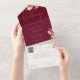 Einmalige Hochzeitseinladung mit eleganter Goldtypografie auf bordeauxrotem Hintergrund. Die Einladung enthält eine perforierte RSVP-Karte mit Ihrem Hochzeitswebseiten QR Code und Details. Entwickelt von Thisisnotme©