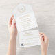Elegant in einer Hochzeitseinladung mit einem sauberen und zeitlosen Design mit Ihrem Monogramm in einem Kranz-Wappen. Verwenden Sie die Vorlage, um einen QR-Code auf der angeschlossenen RSVP-Karte zu generieren.