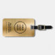 Moderne berufliche Gepäckmarke mit Firmenlogo und QR-Code auf einem vergoldeten Imitat auf metallischem Hintergrund. Fügen Sie Ihren Namen und Titel in einfacher Typografie hinzu.