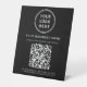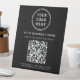 Modernes schwarzes Tischschild für Ihr Unternehmen mit QR-Code für Kunden, um eine Liste Ihrer Produkte, Dienstleistungen, Preise, andere Informationen oder mobilen Zahlungen zu suchen. Laden Sie Ihr Logo und den QR-Code der Website hoch und fügen Sie Ihren eigenen Text, wie Firmenname, Telefonnummer, Straßenanschrift oder andere Informationen in einfacher weißer Schrift hinzu.