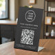 Modernes und einfaches Schild mit schwarzem Tisch für Ihr Unternehmen mit dem QR-Code Ihrer Website für Kunden, um eine Liste Ihrer Produkte, Dienstleistungen und Preise zu suchen. Laden Sie Ihren Qr-Code und Ihr Logo hoch und fügen Sie Ihren Firmennamen, Telefonnummer und Straßenadresse oder andere Informationen in weißem Text hinzu.