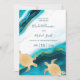 Zwei Goldschildkröten auf einem aquamarinen goldenen Hintergrund. Elegante Hochzeitskarte für den Strand. Mit den Details und einem scannbaren qr Code für Ihre Hochzeitswebsite auf der Rückseite.