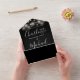 Alles in einer Hochzeitseinladung mit hübschen Saitenlichtern, Signaturstil-Namen und schicke Typografie auf schwarzem Hintergrund. Die Einladung enthält eine perforierte RSVP-Karte mit QR-Code. Entwickelt von Thisisnotme©