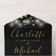 Alles in einer Hochzeitseinladung mit hübschen Saitenlichtern, prächtigen Stilbezeichnungen und schicker Goldtypografie auf schwarzem Hintergrund. Die Einladung enthält eine perforierte RSVP-Karte mit QR-Code. Entwickelt von Thisisnotme©
