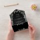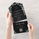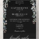 Alle in einer Hochzeitseinladung mit einer schönen Blumenkaskade, eleganter Typografie und Monogramm-Initialen auf schwarzem Hintergrund. Die Einladung enthält eine perforierte RSVP-Karte mit Ihrem Hochzeitswebseiten QR Code und Details. Entwickelt von Thisisnotme©