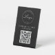 Beruflicher, moderner QR-Code kontaktloses Menü Logo schwarzes Podestal Zeichen. Benutzerdefinierte schwarze Business Vorlage in modernem minimalistischem Stil, die leicht mit Ihrem Firmenlogo, QR-Code und individuellem Text aktualisiert werden kann.