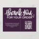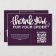 Express your gratitude with our purple QR Code "Thank You for Your Purchase" Card Package Insert. Your customer scan the QR code to reveal a heartfelt message, exclusive offers, or a personalized thank-you note, adding a special touch to your customer's shopping experience. Show appreciation and foster loyalty with this innovative and thoughtful package insert.
