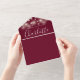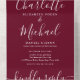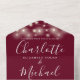 Alles in einer Hochzeitseinladung mit hübschen Saitenlichtern, prächtigen Stilbezeichnungen und schicker Typografie auf bordeauxrotem Hintergrund. Die Einladung enthält eine perforierte RSVP-Karte mit QR-Code. Entwickelt von Thisisnotme©
