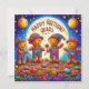 Vier niedliche Lebkuchenmänner feiern auf einem anderen Planeten den Geburtstag von Quads. Sie sind hell gekleidet und bereit für die Erkundung. Die Rückseite der Karte hat eine kleine Nachbildung des vorderen Bildes und viel Platz, um eine Nachricht zu schreiben. AI Bing hat bei der Erstellung der Karte geholfen.