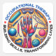 Gebäude-Fähigkeiten, die Leben transformieren Square Sticker für Berufs-Therapeuten. Es zeichnet sich durch eine Reihe von Symbolen aus, die synonym für die Berufstherapie sind, einschließlich der an therapeutischen Aktivitäten verlobten Hände und der gängigen Instrumente wie Resistenzbänder. Das Design betont die Komplexität und Bedeutung der Handtherapie, die durch eine anatomisch detaillierte Handillustrierung hervorgehoben wird. Wählen Sie die Größe des Aufklebers aus dem Menü "Optionen".