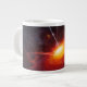 Das Konzept des Künstlers von Quasars. Quasare sind helle, energetische Regionen um riesige, aktive schwarze Löcher in galaktischen Zentren. Obwohl immens mächtig und über Milliarden von Lichtjahren sichtbar, sind Quasare eigentlich ziemlich winzig, zumindest im Vergleich zu einer ganzen Galaxie. Quasare erstrecken sich über ein paar Lichtjahre, und ihre inneren Bereiche, in denen Hochgeschwindigkeits-Winde ausstrahlen, vergleichen sich ungefähr in ihrer Größe nur mit der unseres Sonnensystems. Es dauert etwa zehn Stunden, bis ein Lichtstrahl diese Entfernung überquert. Künstlerische Darstellung von ULAS J1120+0641, ein sehr entfernter Quasar angetrieben von einem schwarzen Loch mit einer Masse zwei Milliarden mal so groß wie die der Sonne.